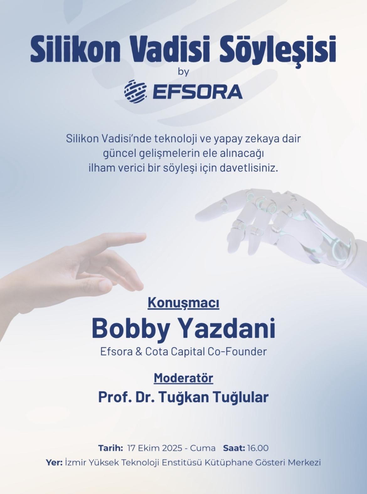 Efsora Labs & Cota Capital Founding Partner Bobby Yazdani will be at the IZTECH Library Performance Center to share the latest developments in technology and artificial intelligence in Silicon Valley.