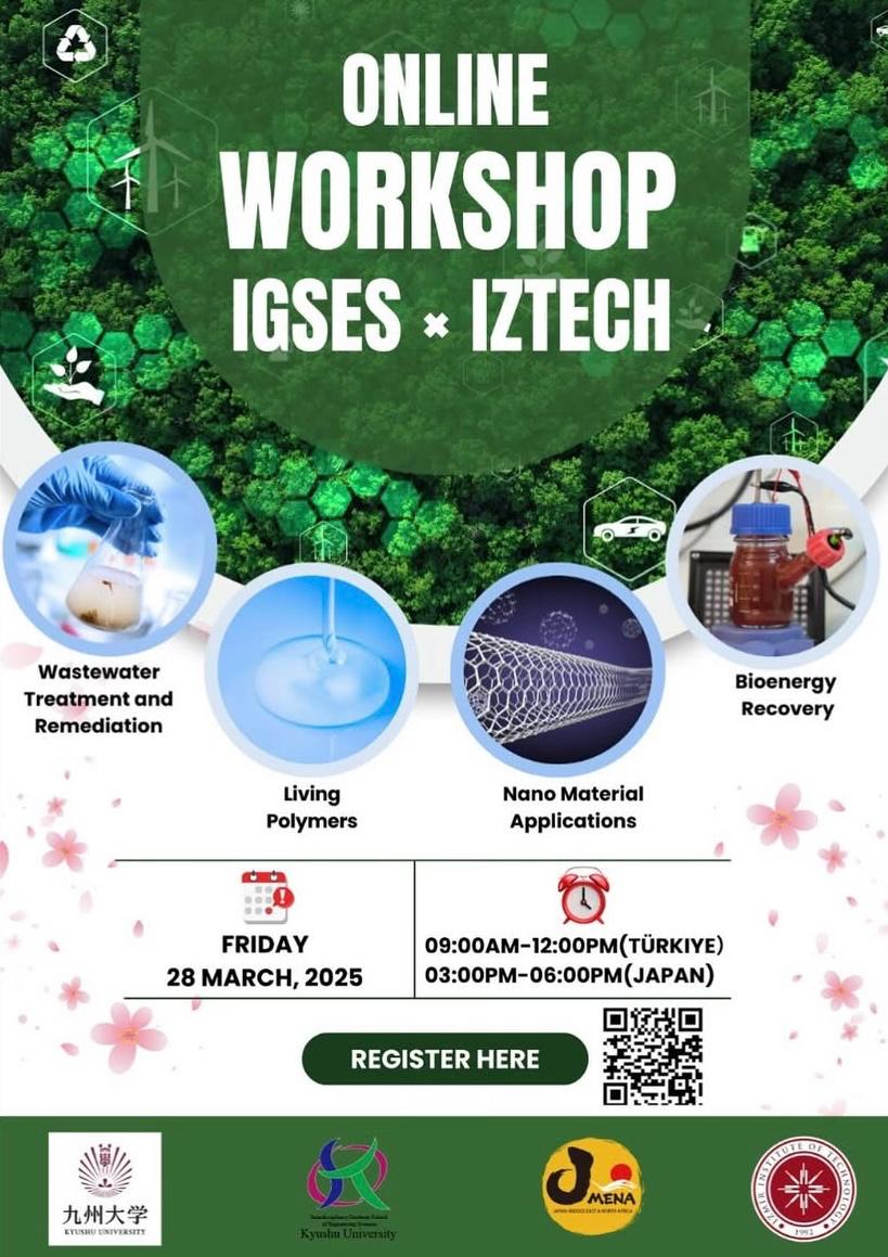 A joint online workshop organized by Kyushu University’s Interdisciplinary Graduate School of Engineering Sciences (IGSES) J-Mena Team (Japan), and the Department of Environmental Engineering was held on March 27, 2025. This international event brought together distinguished researchers from Japan and Türkiye to discuss wastewater treatment and soil remediation technologies, bioenergy recovery, and nanomaterials. The workshop also aimed to foster international collaboration with the support of the IZTECH Research Directorate and IZTECH International Office.