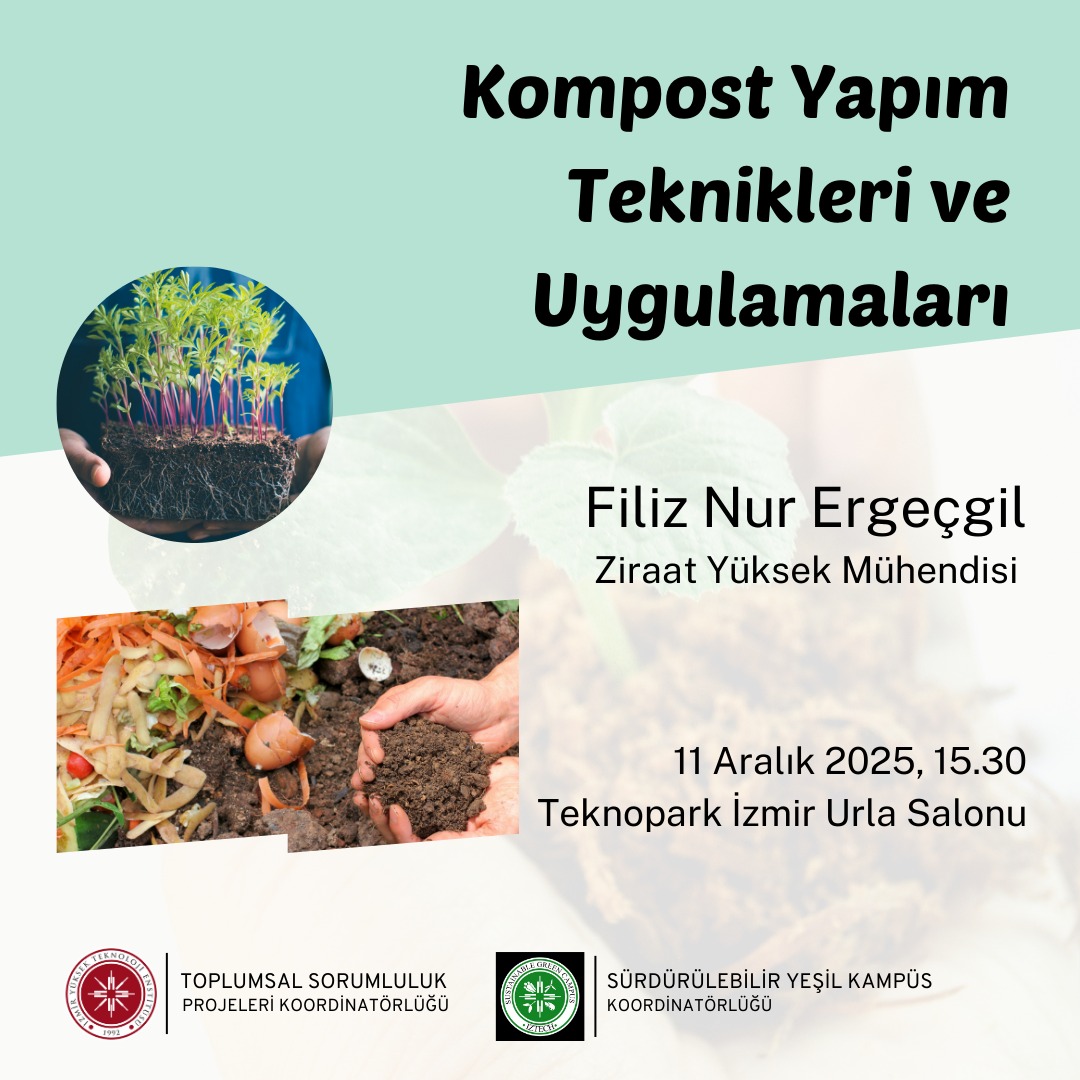 On Thursday, December 11, 2025, between 15:30 and 16:30, a session titled “Composting Techniques and Applications” will be held by Agricultural Engineer Filiz Nur Ergeçgil in the Urla Hall on the ground floor of the Technopark İzmir Building.