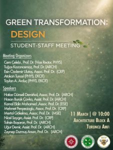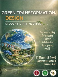 The Sustainable Green Campus Coordinatorship, in collaboration with the Ecology Conservation Student Community (EKOT), is pleased to announce the first event of the three-part “Green Transition Student–Faculty Meeting” series, which will take place at the Turuncu Amfi (A112), Faculty of Architecture.