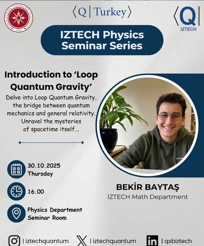 In this seminar, Bekir Baytaş, a faculty member of the Mathematics Department at Izmir Institute of Technology, will explain Loop Quantum Gravity theory, which attempts to understand the fabric of the universe at the quantum level.